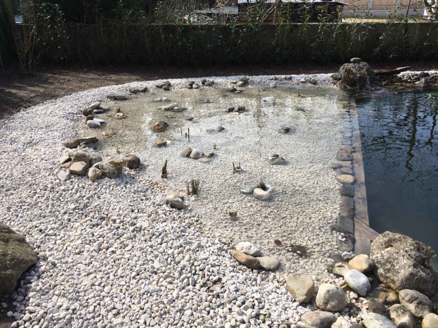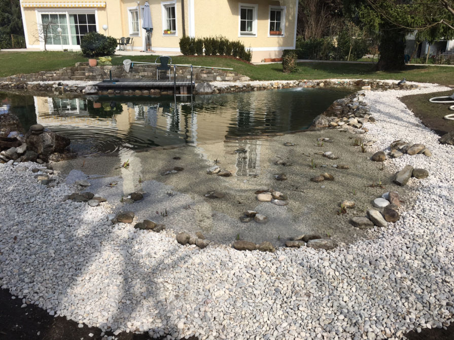 Bei diesem Projekt wurde die Biofilterzone eines Teiches erneuert. Dabei wurde Filterkies in verschiedenen Körnungen und einzelnen Schichten eingebracht. Um die Filterleistung zu verbessern wurde zusätzlich Zeolit, ein Granulat das Schadstoffe bindet, verwendet.
