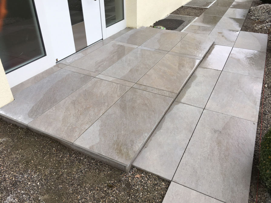 Hier wurden Betonplatten durch hochwertige Keramikplatten ersetzt. Ausgefugt wurde mit einem wasserdurchlässigem Pflasterfugenmörtel auf Epoxidharzbasis.