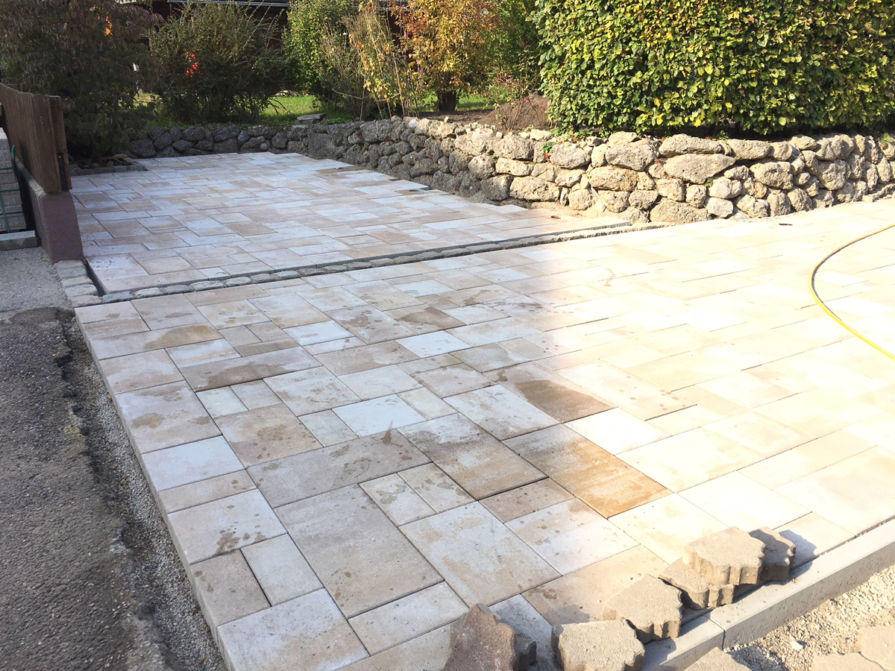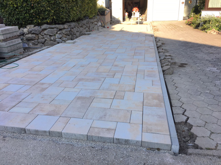 Bei dieser Baustelle wurden Betonplatten im wilden Verband in eine Garagenzufahrt gelegt.